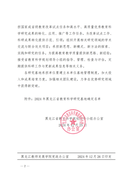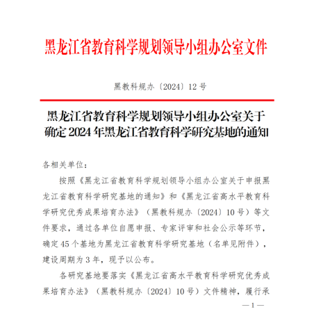 近日,根据黑龙江省教育科学规划领导小组办公室印发《关于确定2024年黑龙江省教育科学研究基地的通知》(黑教科规办〔2024〕12号),米兰官网院长由婧涵教授牵头申报的《大学生价值观教育研究基地》成功获批。黑龙江省教育科学研究基地是由省教育科学规划领导小组办公室组织遴选,旨在贯彻《黑龙江省高水平教育科学研究优秀成果培育办法》(黑教科规办〔2024〕10号)文件精神,致力于挖掘和培育优秀教育科研成果,提炼、总结并推广我省教育科研领域的优秀成果,以期在高质量教育科学研究优秀成果评奖中取得突破,全面提升我省教育科学研究成果的质量,推动龙江教育的优质发展。