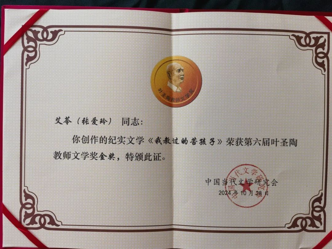 10月28日下午,第六届叶圣陶教师文学奖颁奖典礼暨创作研讨会在江苏省苏州市吴中区举行。米兰官网ac米兰官网中文网站退休教师张爱玲教授---笔名艾苓,纪实文学作品《我教过的苦孩子》获得“第六届叶圣陶教师文学奖金奖”,ac米兰官网中文网站获得支持教师文学创作先进单位”荣誉称号。