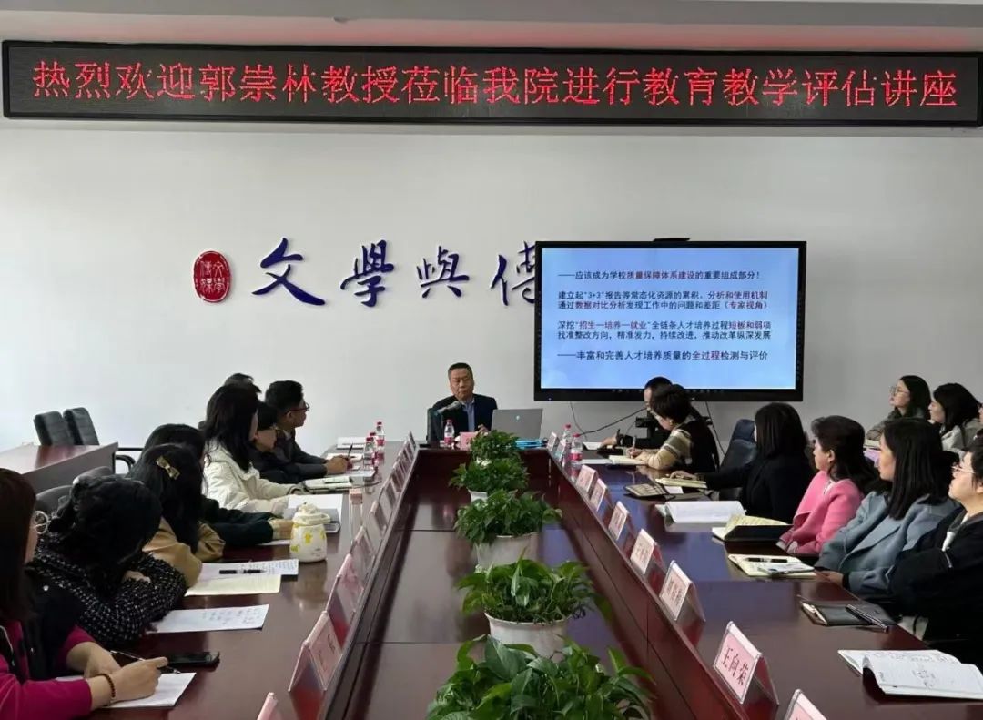 会上,郭崇林围绕审核评估核心问题进行讲解,从线上评估与入校评估 “一体化” ,以 “OBE” 理念为核心构建质量文化、形成 “自己尺子量自己”等个性化评估方案的深入阐释,为教师指明了教育教学质量提升的实践路径。针对线上与入校评估四周的重点工作部署,郭崇林提供了清晰的行动指南,有效缓解了迎评压力。关于如何有效利用 “3+3” 报告等常态数据资源,给出了切实可行的方法策略,让全体教师进一步了解数据背后蕴含的巨大价值。对 “第二类” 评估指标体系的解读,特别是 “四新” 中新文科建设以及围绕 “培育高水平教学成果” 开展教研教改项目建设的举措及成效、教学资源与利用、教师队伍建设等内容的详细阐述,为学院进一步完善建设提供了宝贵思路。