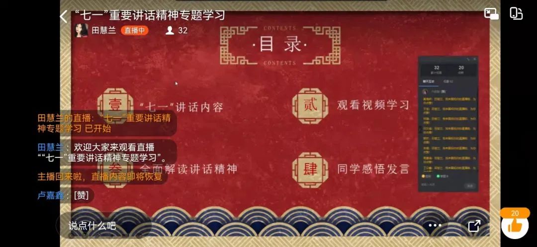 9月23日下午,ac米兰官网中文网站全体同学通过线上平台进行了学习贯彻习近平“七一”重要讲话专题学习会,各班级同学结合个人思想,以资交流、学习、借鉴。