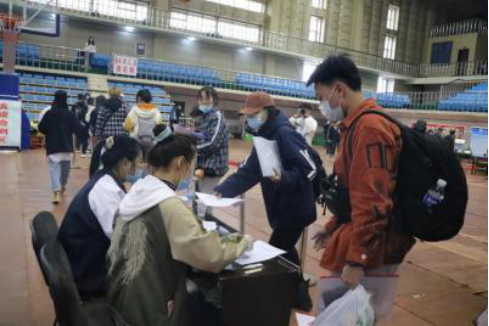 迎接工作如火如荼地进行着,即使天气寒冷也丝毫阻挡不了志愿者们的热情。体育馆内除了志愿者们忙碌的身影外,米兰官网党总支书记唐国忠、党总支副书记兼2020级辅导员赵林楠、2017级辅导员韩金凤、2018级辅导员鞠亚林、2019 级辅导员潘立坤都来到了现场全程参与迎新工作,同志愿者们一起迎接新同学的到来。