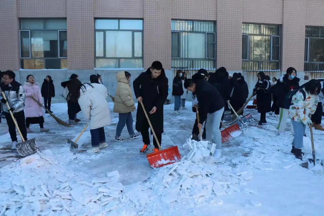 活动开始,各班班长将清雪工具分发给同学,同学们有序地清理道路积雪。大家团结协作、不畏严寒,他们有的挥舞铁锹铲起雪块,有的手拿扫帚清扫路面。经过半个多小时的打扫,汇文楼广场及西侧小路的积雪基本清除。