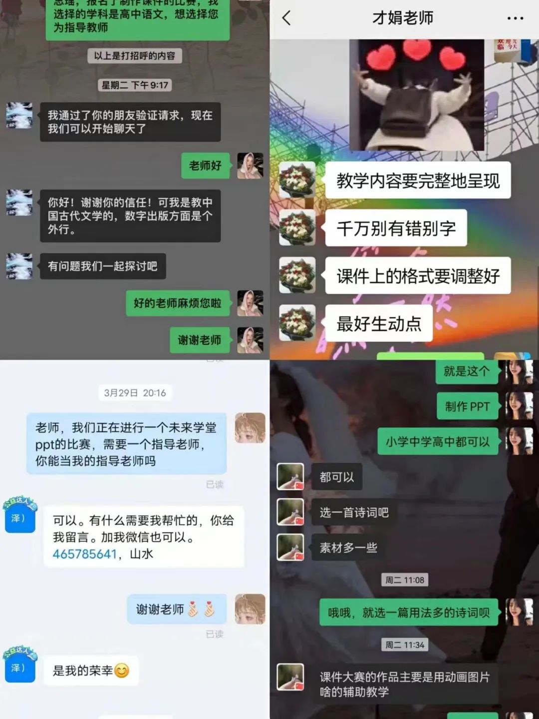 张佐娟老师老师首先要求学生明确本课件要讲什么?要求抓重点,抓中心,抓关键,理清思路,着重分析艺术特色,而且,为了让学生自主思考,张老师秉持“师傅领进门修行在个人”的指导观念,在张老师确定好大方向后,让学生独立思考,自悟自省。徐洁老师深入比赛QQ群,紧跟大赛方向,指导学生扬长避短,做自己所擅长的,在自身强项之处发挥优势,为参赛选手加油打气,树立信心,乐观备赛。王向荣老师对所指导学生以文学鉴赏为例,领悟到语文课之美,同时告诉学生课件大赛是一节无声的语文课,要在课件设计中体现道德人格等综合素质。邓媛媛老师在平日里,就特别平易近人,邓老师对学生们在课件制作中出现的问题亲自指导修改,学生们在邓老师的指导下不仅得到了专业能力的提升,还收获到了一份珍贵的师生情谊。