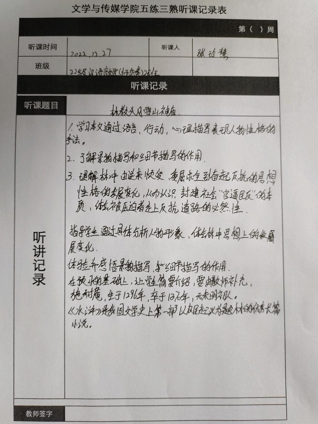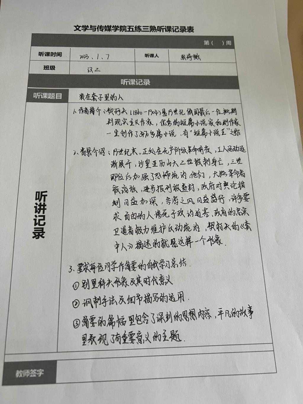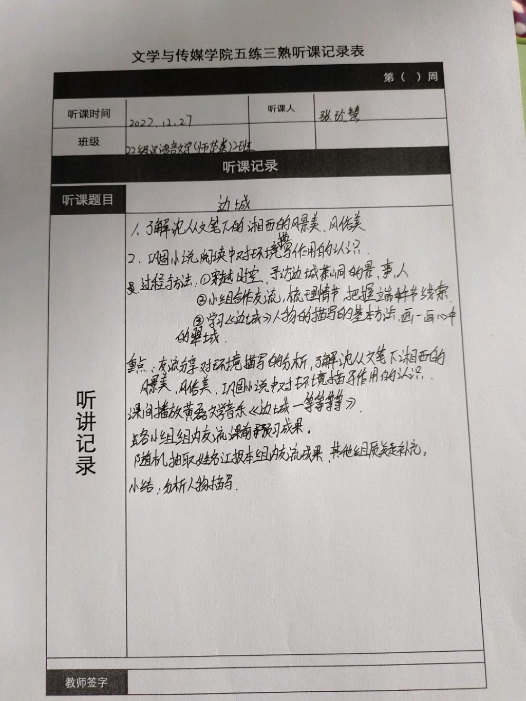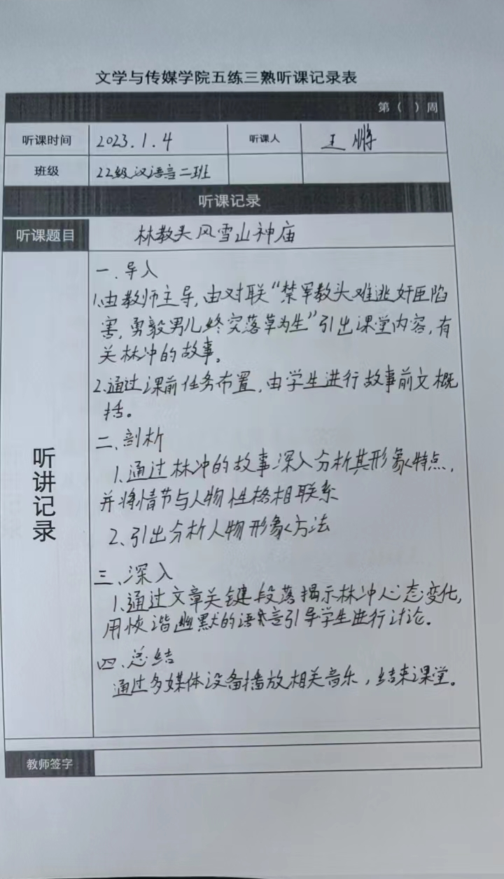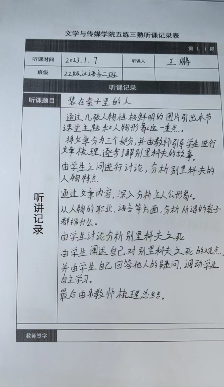 听课记录是听课的第一手资料,是课后进行教学反思交流的材料和依据,更是促进教师专业成长和提高教学水平的极其宝贵财富,为使汉语言专业学生更好的学习专业技能,ac米兰官网中文网站特开展听课笔记优秀作品展示活动,让我们一起来看看同学们的听课记录表吧!