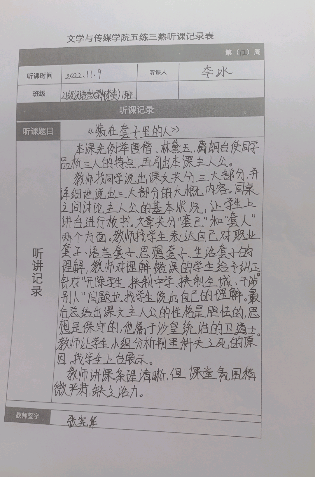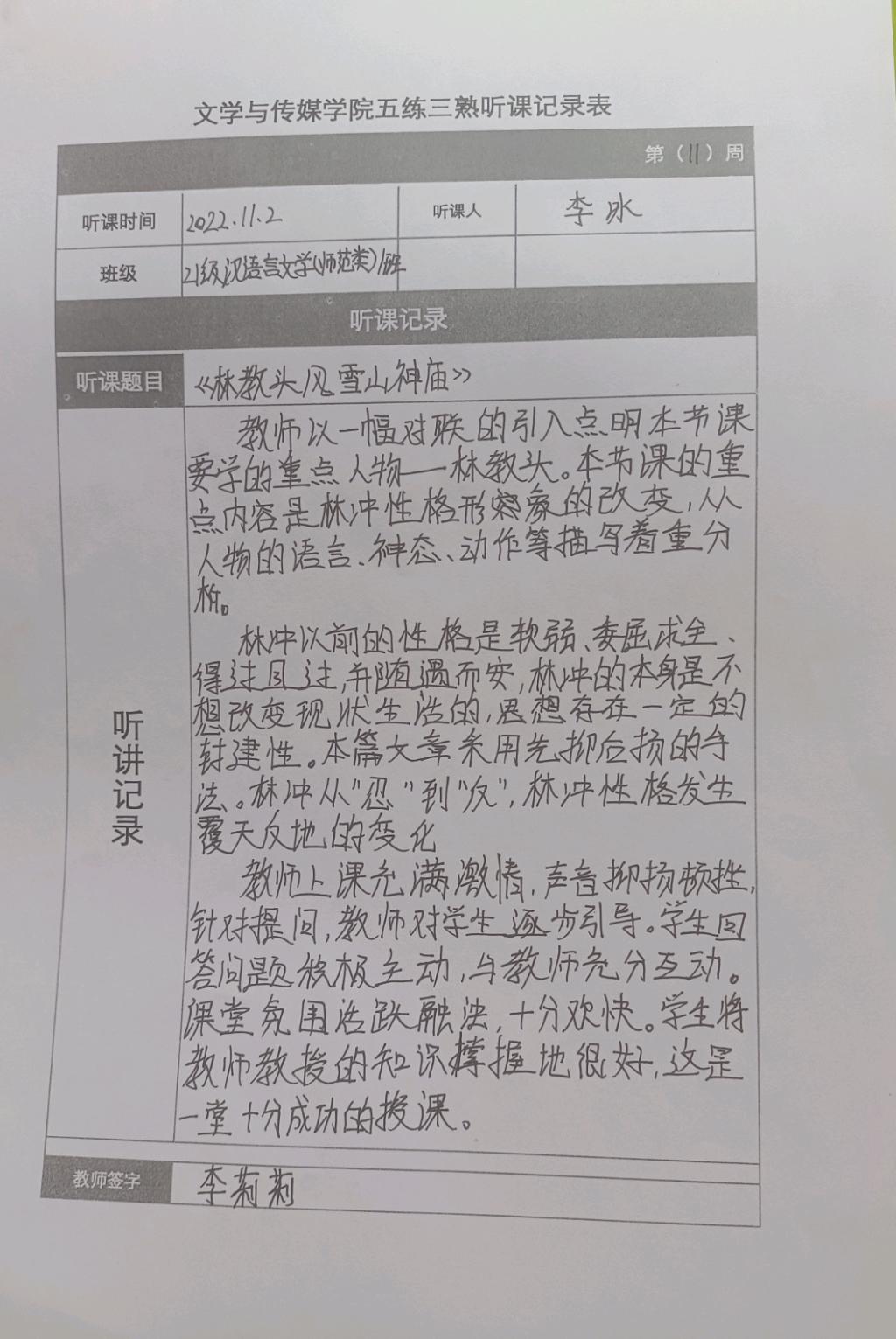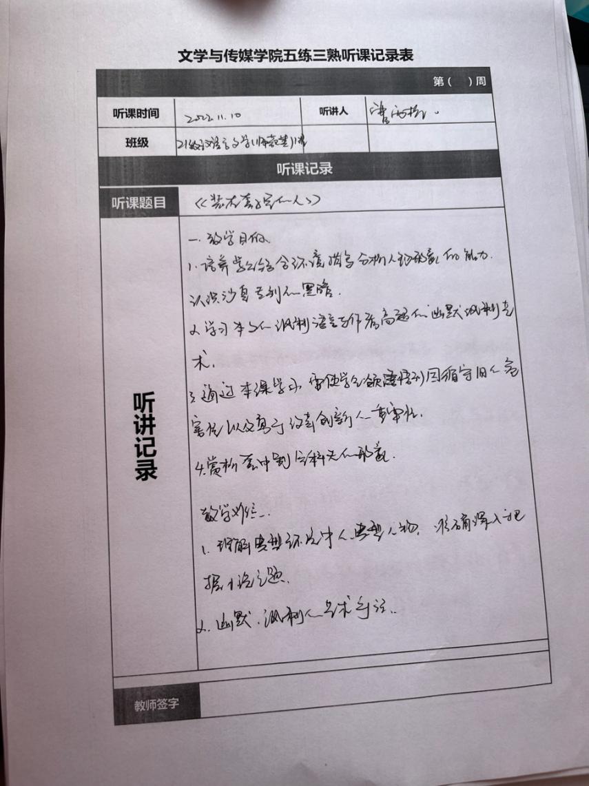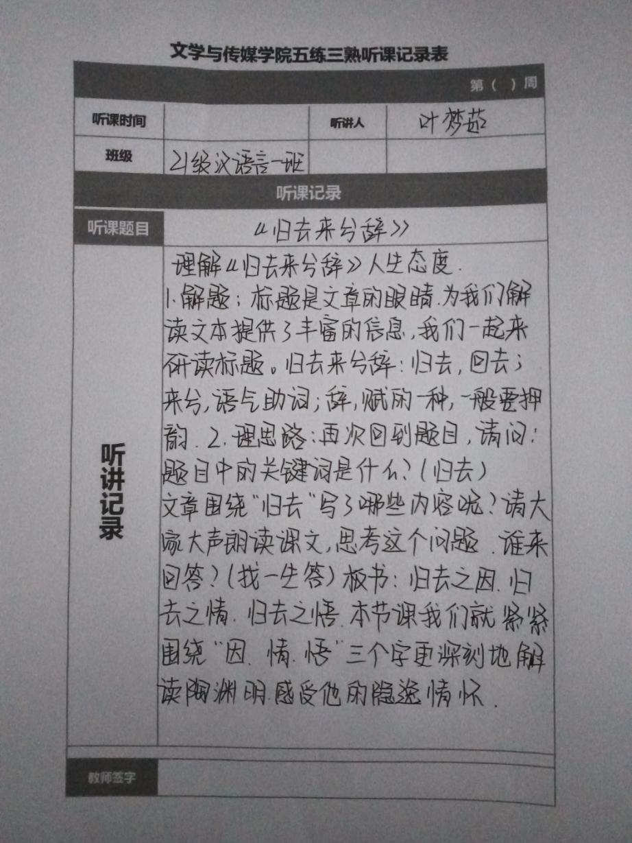 听课记录是听课的第一手资料,是课后进行教学反思交流的材料和依据,更是促进教师专业成长和提高教学水平的极其宝贵财富,为使汉语言专业学生更好的学习专业技能,ac米兰官网中文网站特开展听课笔记优秀作品展示活动,让我们一起来看看同学们的听课记录表吧!