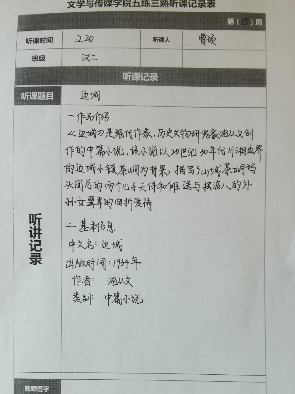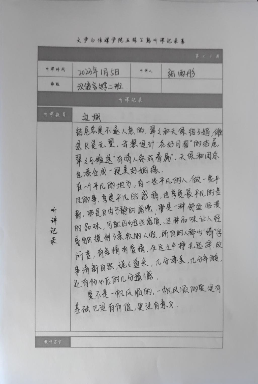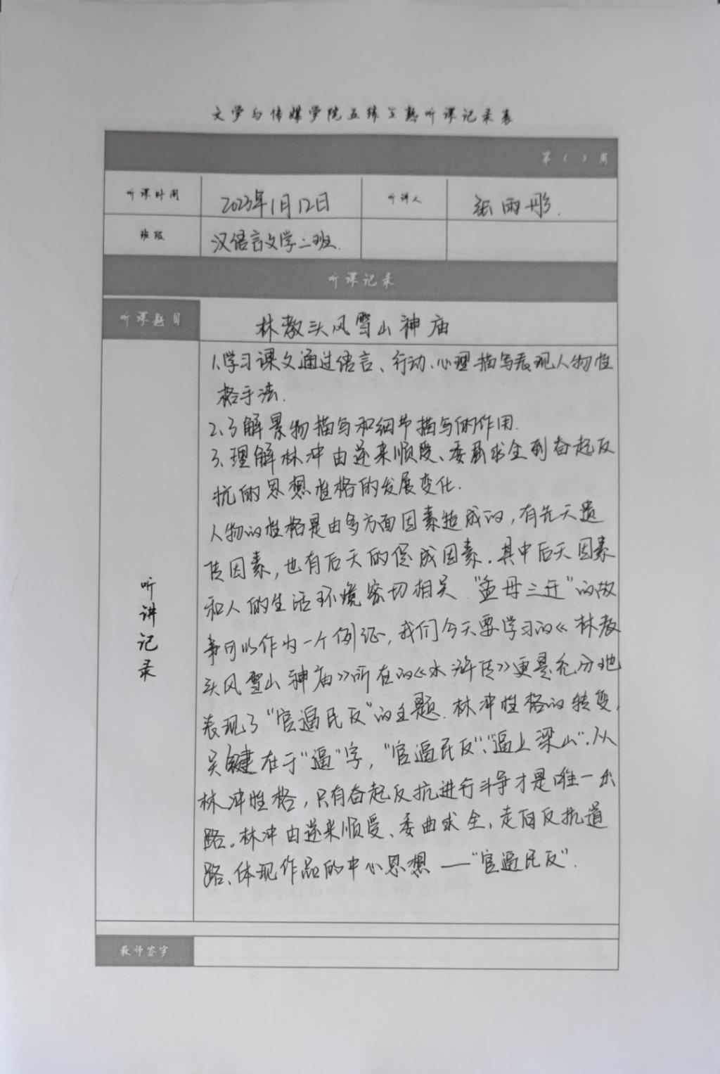 听课记录是听课的第一手资料,是课后进行教学反思交流的材料和依据,更是促进教师专业成长和提高教学水平的极其宝贵财富,为使汉语言专业学生更好的学习专业技能,ac米兰官网中文网站特开展听课笔记优秀作品展示活动,让我们一起来看看同学们的听课记录表吧!