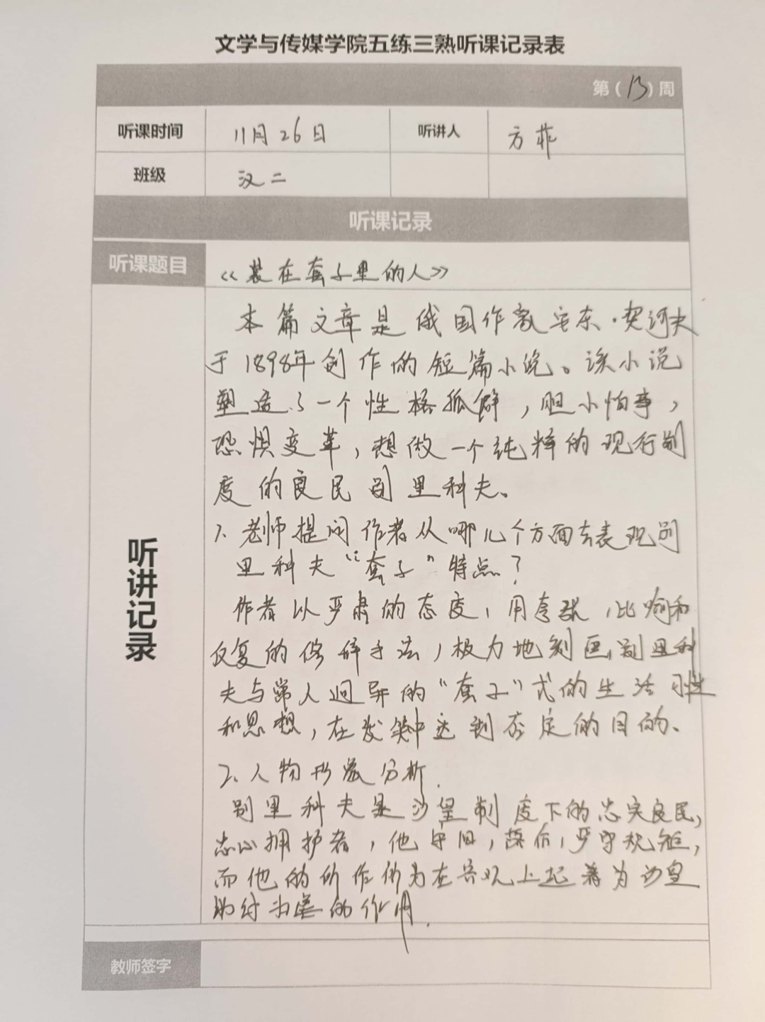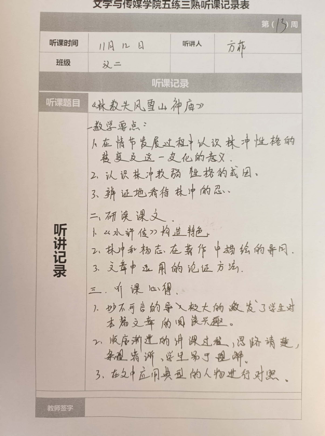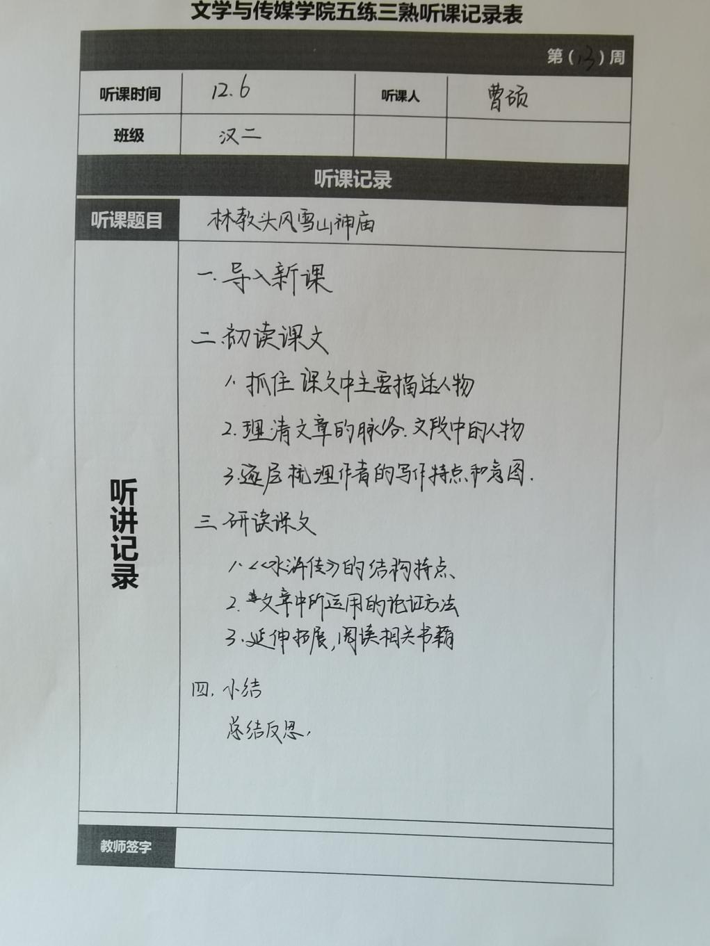听课记录是听课的第一手资料,是课后进行教学反思交流的材料和依据,更是促进教师专业成长和提高教学水平的极其宝贵财富,为使汉语言专业学生更好的学习专业技能,ac米兰官网中文网站特开展听课笔记优秀作品展示活动,让我们一起来看看同学们的听课记录表吧!