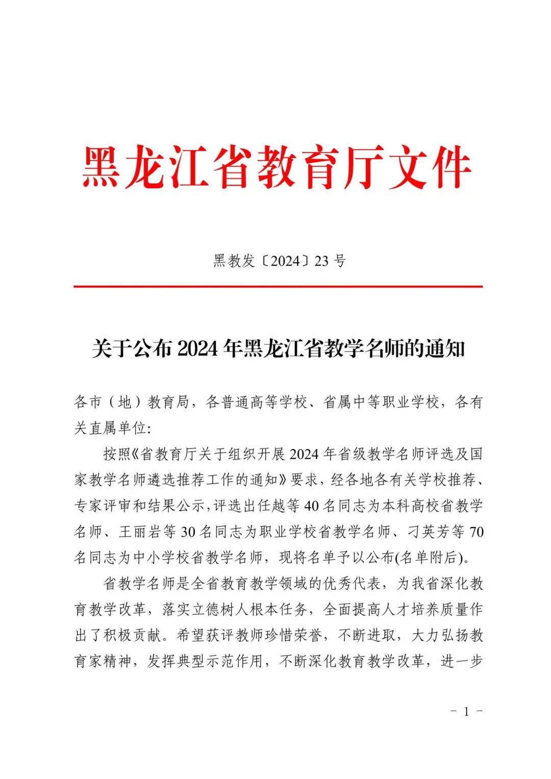 4月3日,省教育厅下发通知,公布了2024年黑龙江省教学名师评选结果,米兰官网ac米兰官网中文网站由婧涵教授获评黑龙江省教学名师。