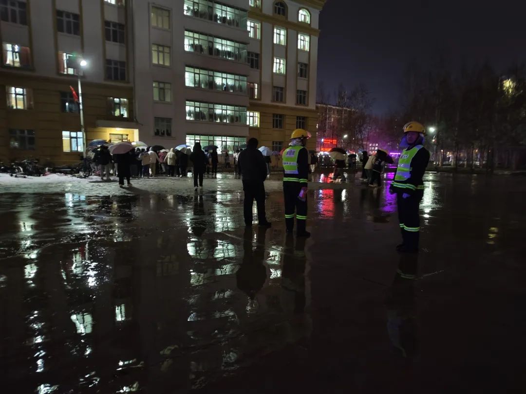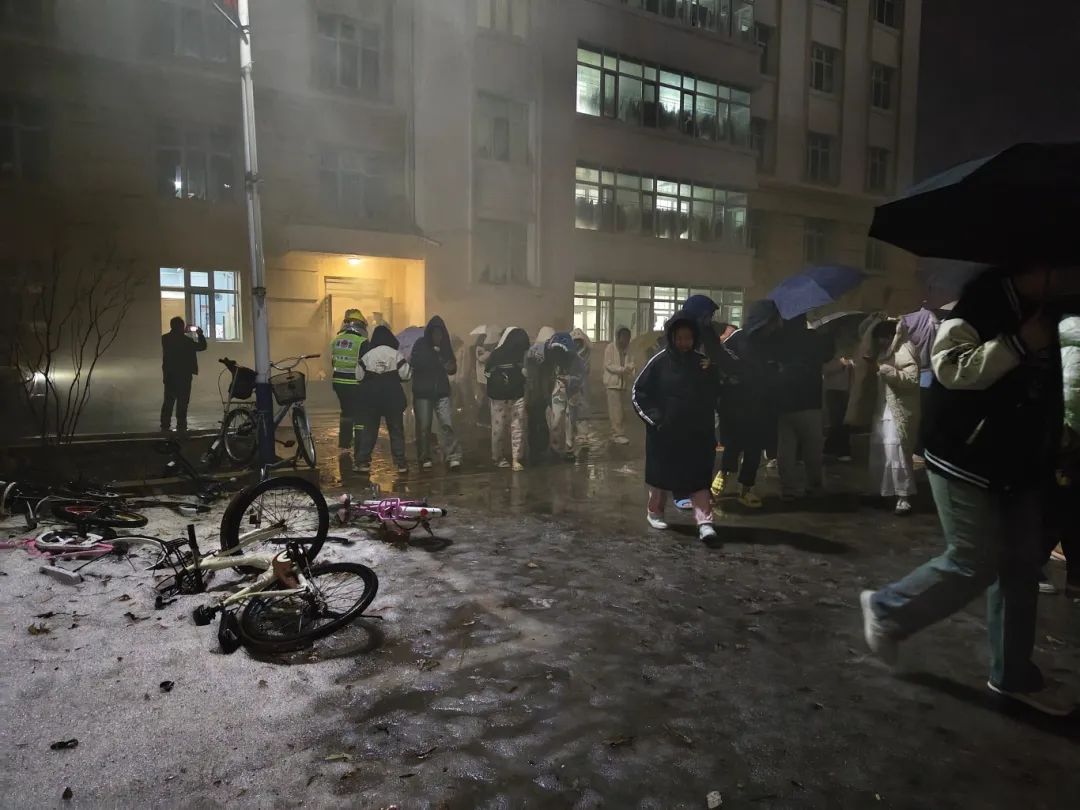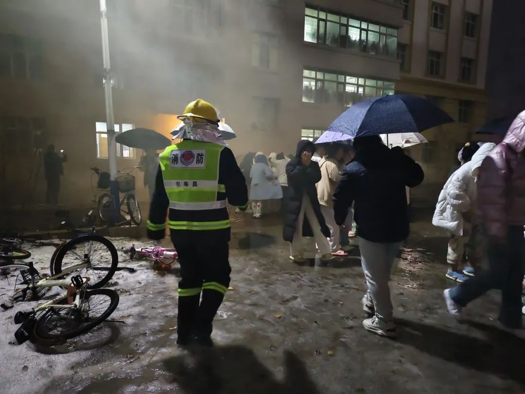 晚上19时,演练开始,在消防部门的指引下,拉响警报。在模拟火灾发生的场景下,大家迅速按照逃生指示标识和路线,用手中的湿毛巾捂住口鼻,井然有序地从消防通道撤离至学校安全地带,列队清点人数。