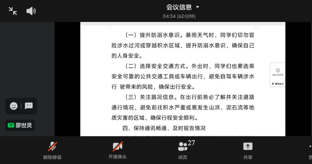 首先加强防汛教育,增强防汛意识,密切关注气象动态。提醒广大学生密切关注当地气象部门发布的天气预报及预警信息,提前规划并落实相应的防范措施,尽量避免极端天气出行,确保安全。在线上班会中,各班对学生进行了“防汛、防雷、防水、山洪、暴雨、雷击、泥石流、山体滑坡、地震”等系列性的安全知识教育,增强学生们对防汛的安全意识,同学们也学习了很多关于防洪防汛的知识,了解了当洪水发生时,一定要冷静,不要惊慌,要迅速寻找合适的方法离开现场。