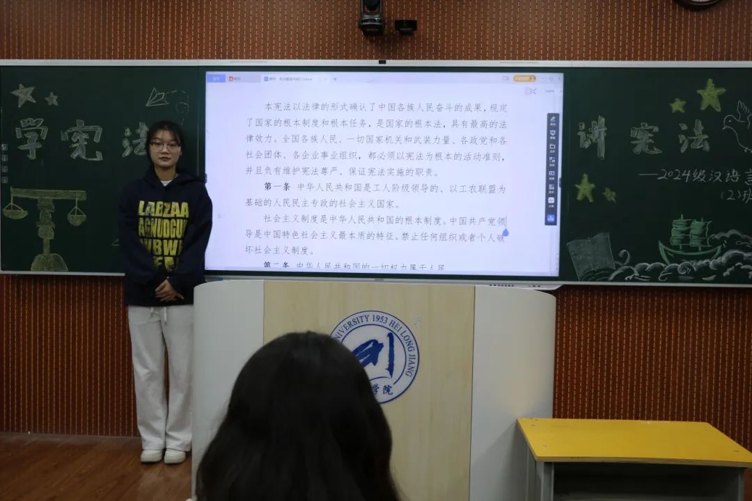 活动中,各班团支书首先向同学们简单介绍了宪法的一些内容及条例,为大家普及了一些宪法知识。随后,带领同学们朗读法律条例,用声音传递对宪法的崇尚和信仰。这是法律知识的传递,更是法治精神的传承。最后,各班团支书从知法、守法、用法三个方面讲述了当代青年大学生应怎样将宪法精神内化于心,外化于行,并呼吁全体大学生用实际行动践行宪法原则,做守法的公民,为建设法治社会贡献自己的力量。