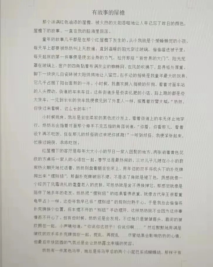童年的故事里,记忆最深刻的就是在红屋檐下发生的那些故事,如今已经长大,我想将这段美好藏进心里,以后也要适应新的环境,不断努力,成为优秀的人。通过写作,我可以看到那个真实的自己,我希望自己对写作永远保持热爱与初心,不断学习进步,成为更好的自己。