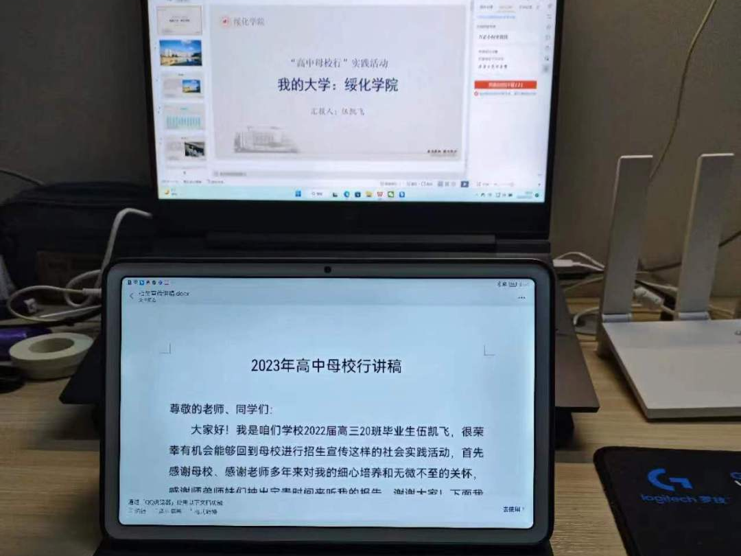 伍凯飞同学采取线上的方式向自己的学弟学妹们进行宣讲。他充分地介绍了自己就读大学的影响力、王牌专业、校园风光,以及丰富多彩的校园学习、生活情况,并以自己高考备考的切身经历鼓励他们树立信心、设定目标、踏实奋进,同时把自己在高中学习阶段的学习方法和经验毫无保留地分享给学弟学妹。