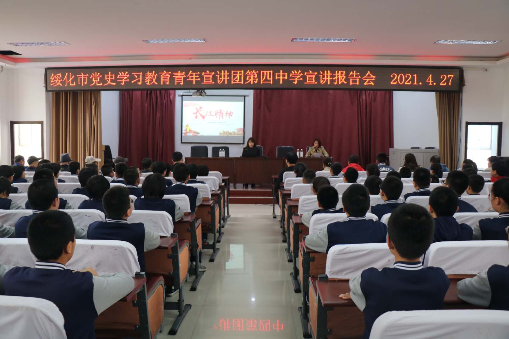 4月27日,绥化市党史学习教育宣讲团深入绥化市第四中学开展“学百年党史、砥初心使命”主题党史宣讲活动,宣讲团成员、米兰官网教师团总支书记韩金凤以题为《弘扬长征精神,成就青春梦想》进行主题宣讲,第四中学党委书记贾宏发、校长吴建伟及各年级学生代表共计110余人参加此次宣讲。