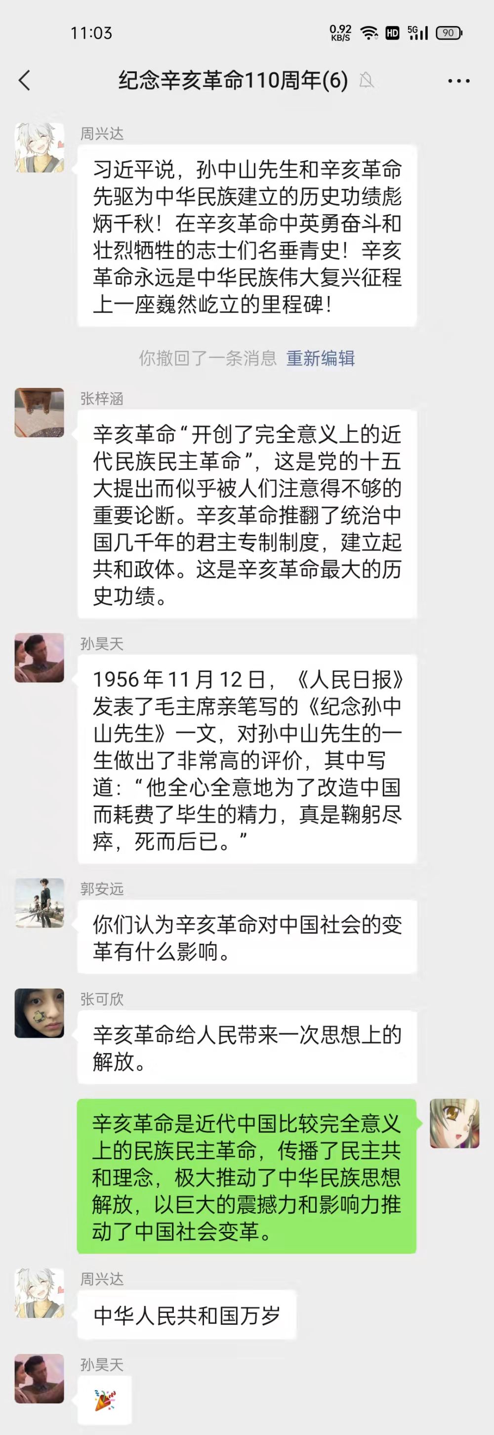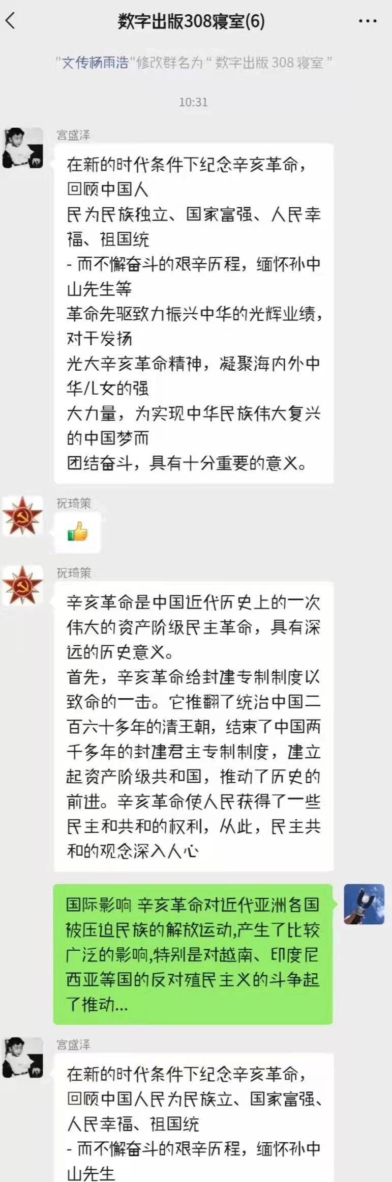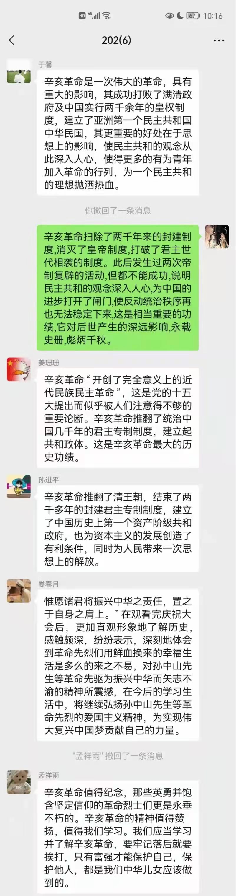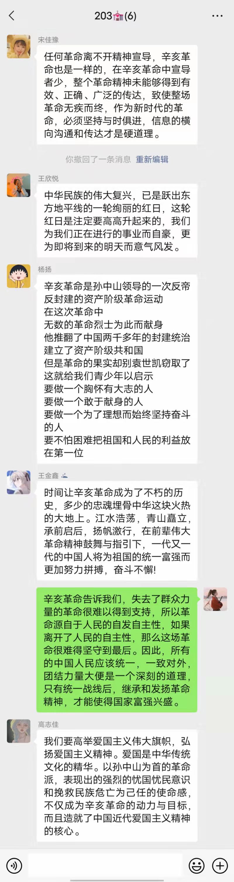 观看结束后,同学们以寝室为单位开展深刻讨论,抒发爱国情怀。2019级网络与新媒体专业一班芦艾嘉同学感悟到:在新的历史条件下纪念辛亥革命,回顾一百多年来中国人民为民族独立、国家富强、人民幸福、祖国统一而不懈奋斗的艰辛历程具有十分重要的现实意义。辛亥革命的崇高理想给我们留下敢于突破、敢于尝试、敢为人先的无畏精神。这种精神具有爆发力和原创力,是一种宝贵的人文精神。