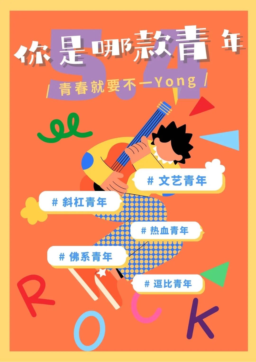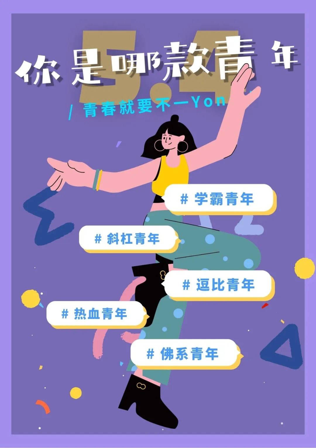 今天展播新媒体海报设计佳作奖艺术设计学院视觉传达设计专业刘沙的作品:《你是哪款青年》